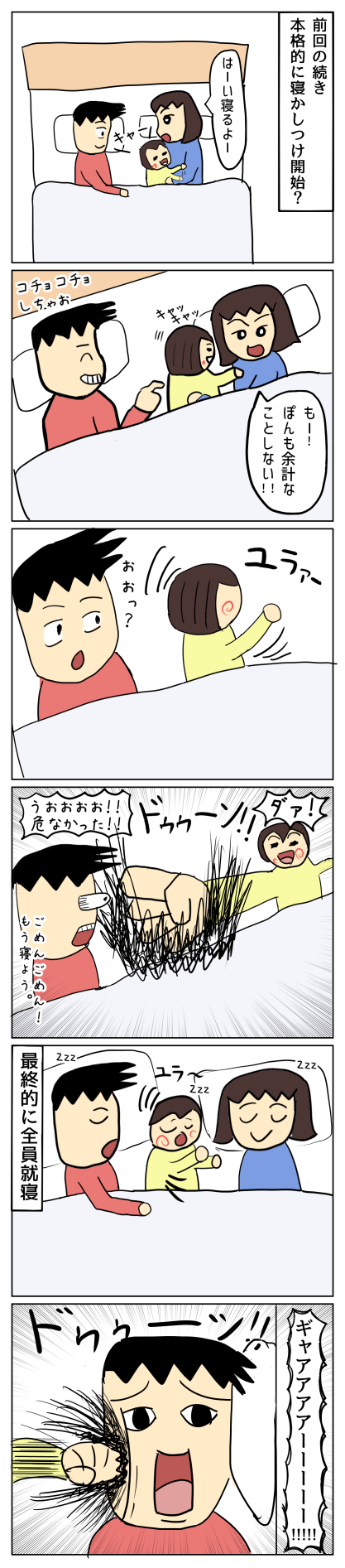 0歳児のパンチ manga X Facebook はてブ LINE コピー 2026.03.19 ぐっすり寝てたら急にドンッって音がしたので目を覚ますと視界がぐにゃっとしていました・・・軽く脳震盪起こしてたかもしれない・・・親子三人で川の字で寝るという夢が命がけだったなんて育児本には書いてなかったよあとちょっかいだしてごめんね。※ちなみにいつもちーまるは別のマットで寝ています。たまに一緒の場所で寝ることもあったり。みなさんはどうしていますか?^^