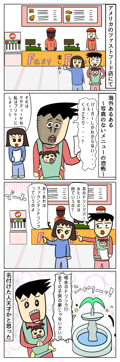アメリカの天才ネーミング manga X Facebook はてブ LINE コピー 2026.03.26 ファウンテンドリンクって名前は、アメリカに来て感動した一番の名前です。店によりますが、基本的にはおかわり自由のようです。※ただし回しのみなどはNGちなみにファストフード店などは看板などにメニューのイラストがかかれていることもあるのでイメージしやすいですが、レストランになるとイラストなしの英語のメニュー表になるのでご注意を。私はいつもぽこに教えてもらっていますorz