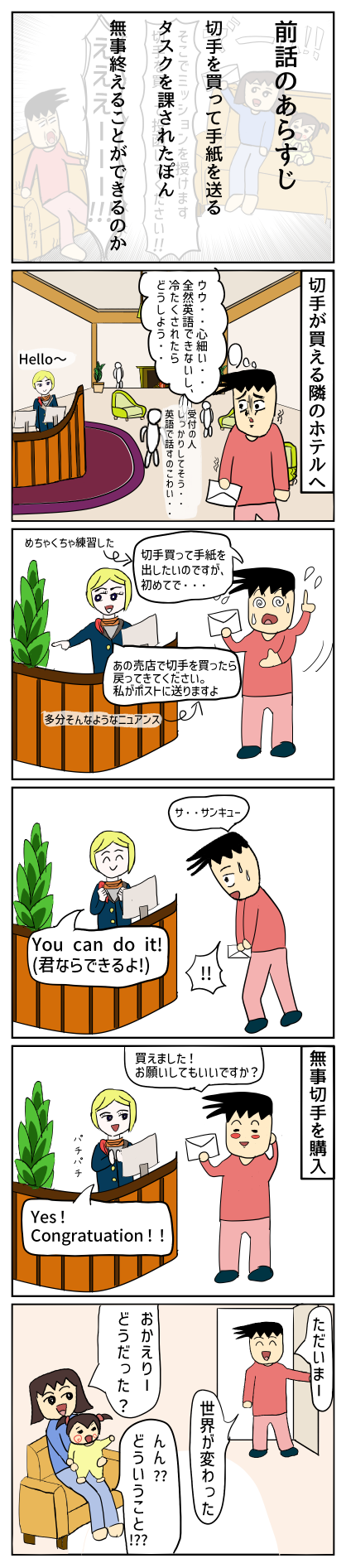 ミッション達成なるか manga X Facebook はてブ LINE コピー 2026.04.02 滞在しているホテルよりも大きいホテルだったので人も多いし、ロビーも広いし始めは緊張がピークでした・・・でも受付の方がとても親切だったのでほんと輝いて見えました。人に親切にするって大事。あと人と話すことも大事だということを改めて実感しました。こちらに来てから家族以外とほぼ話してなく、少し塞ぎこんでしまっていましたが、すごくすっきりしたことを覚えています。これから友達もできるといいな^^