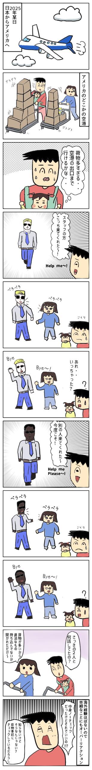 ぽん一家 アメリカ着陸 manga X Facebook はてブ LINE コピー 2026.01.292026.01.30 アメリカ着陸!荷物が多すぎて来てくれた人が神に見えた!…のも束の間、ただの荷物チェック。気持ちを大きく揺さぶられ、アメリカの洗礼を(勝手に)受けるぽんと全く動じない妻のぽこでした。 いやー海外行くのなんて5年以上ぶりだし、観光じゃないのなんて初めてだし全てが怖い笑次回 空港をでれるのか??
