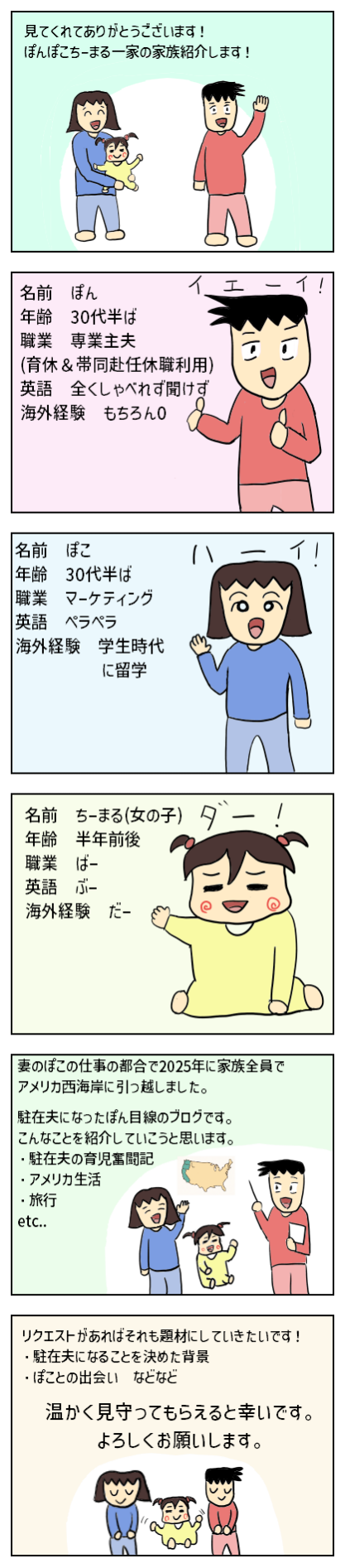 ぽんぽこちーまる一家紹介 manga X Facebook はてブ LINE コピー 2026.02.09 無事アメリカのホテルにも着いたので自己紹介回でした!今は2026年ということもあり、少しペースが掴めてきたので本ブログを開設いたしました。右も左もわからず、先輩ブロガーの皆様の投稿を参考にしながら続けていこうと思います。よろしくお願いします!!!