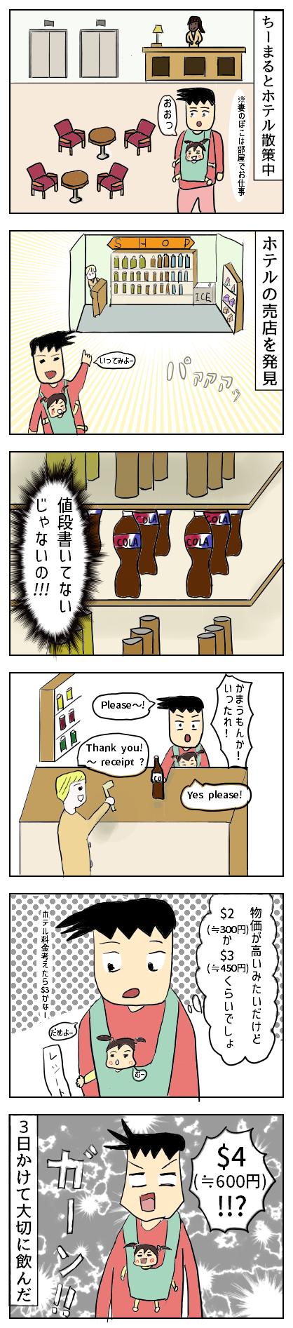 アメリカのホテル探検! manga X Facebook はてブ LINE コピー 2026.02.16 160円くらいで飲んでたジュースが4倍した…ホテル価格だからかな?と思ってスーパーとか薬局とかで見ると$2.5≒375円くらい。少し安心したけどそれでも高かった…渡米直後日本円計算を毎回していて、食材買うのにも時間がかかって一苦労。今は少し慣れてきて計算しないで買うようになってきた。(何も考えてないだけ?笑)